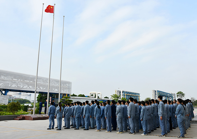 在揭陽新材料基地項目部同步進行的升國旗儀式上,黨委副書記、董事、紀委書記兼揭陽公司董事長唐泉涌強調,當前正值醋酸項目建設的攻堅時期,全體員工要以“時不我待”的緊迫感、“舍我其誰”的責任感、“功成有我”的使命感,發揚“有條件要上,沒有條件創造條件也要上”的鐵人精神,聚焦關鍵節點任務,嚴格把好安全關、進度關、質量關,全力沖刺2024年底項目中交的目標。