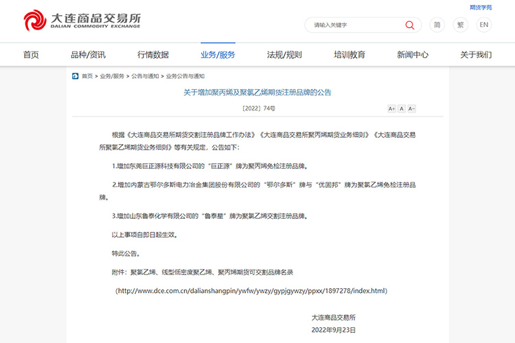 9月23日,大連商品交易所發布公告,增加東莞巨正源科技有限公司的“巨正源”牌為聚丙烯免檢注冊品牌。