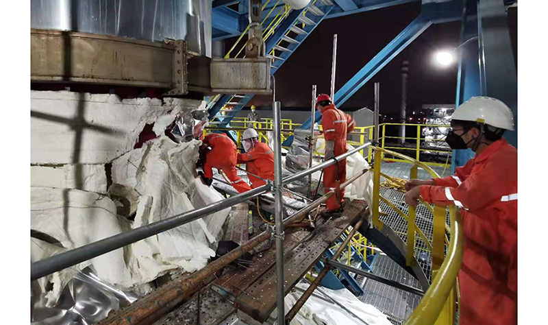 2月12日早上,丙烷脫氫裝置再生空氣進(jìn)料加熱爐錐段和直管管段焊縫開(kāi)裂,裂縫長(zhǎng)達(dá)2.5m,650℃的高溫再生空氣從裂縫漏出。公司高度重視,立即啟動(dòng)緊急預(yù)案,特護(hù)運(yùn)行,討論堵漏方案,落實(shí)特殊作業(yè)施工隊(duì)伍,按照政府及公司規(guī)定完成入廠教育及疫情期間人員備案,嚴(yán)防死守做好防疫工作,組織高溫堵漏隊(duì)伍進(jìn)場(chǎng)。