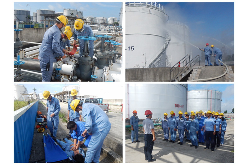 上午9:00,15號罐進出油短管發生泄漏,警報鈴響起,演練開始。救援隊伍向事故點緊急集結、各應急小組迅速開展救援工作。演練模擬堵漏過程中,由于金屬意外碰撞產生火花,現場發生火災。搶險救災組、物資供應組使用水槍、泡沫槍撲救初起火災。在向公司領導報告后,通信聯絡人員按指示向茂港消防大隊請求救援。9:30,火勢失控,引起油罐爆炸,救援人員緊急撤退。在消防大隊抵達現場后,應急小組協助消防員開展滅火救災工作。經過緊張的應急處置,火災在9:42分最終被撲滅。