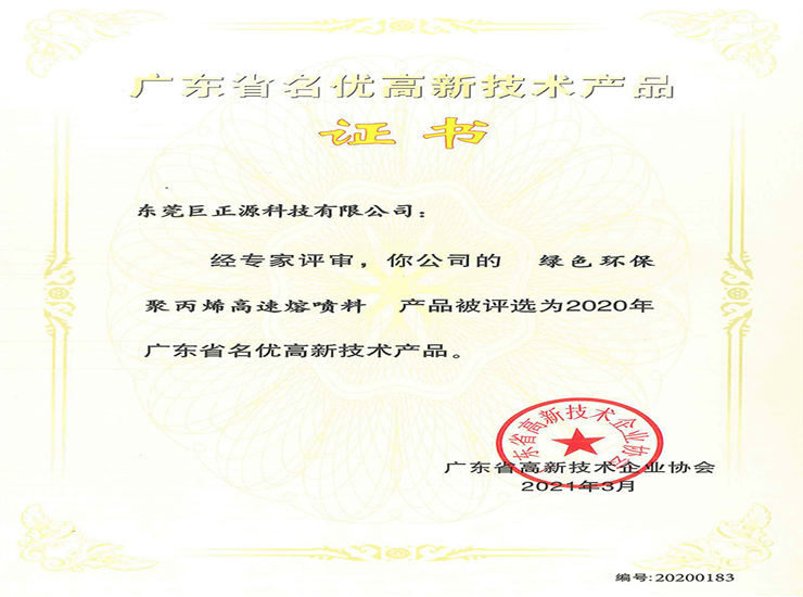廣東省名優(yōu)高新技術產品證書(熔噴料)