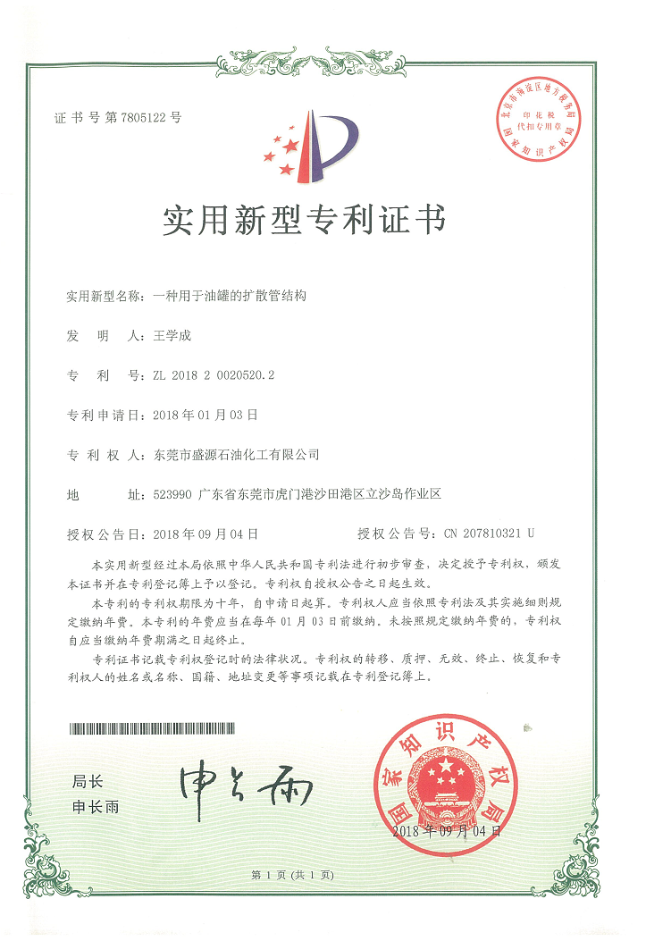 實用新型擴散管結構專利證書