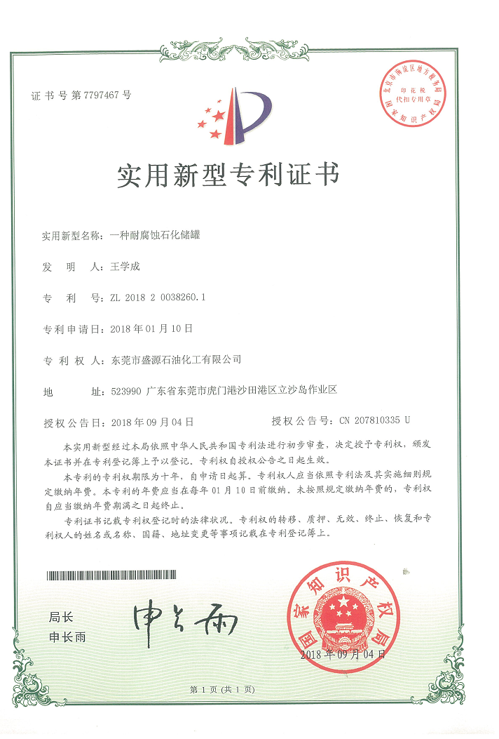 實用新型防風石化儲罐專利證書
